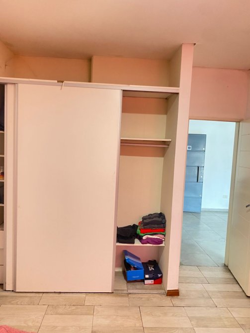 Un baño completo con ducha y una habitacion con placard y ventana al frente del edificio